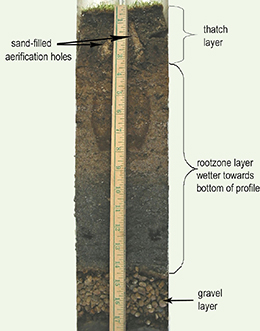 The ability to visually observe the current condition of the green is what makes soil profiles so powerful. Problems such as layering (which disrupts water movement) are often evident once the profile is evaluated. Additionally, inconsistencies in green depths, migration of sand into the gravel layer, and root growth problems and successes can also be identified.