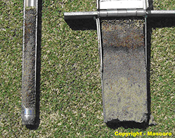 Figure 1 shows profile samples taken with two different types of samplers. These samplers are great for routine observations of the soil profile. The smaller tubular samplers typically provide a fast method for observing soil conditions. Wedge samplers provide a bigger viewing area. With both of these types of samplers you can observe issues such as soil layering and organic build up at the green surface. The larger profilers may also provide additional visuals such as root structure and pest presence.