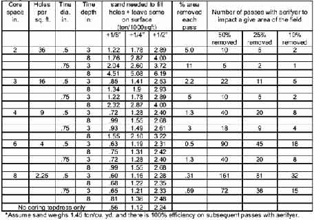 Amount of Sand Required and Area Impacted for Various Coring & Topdressing Programs.