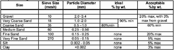 In the case of soil modification, the most effective modification, greatest change in physical properties with the least amount of added sand, has been obtained from sands in the very coarse to coarse size range. Rounded sands that are narrowly graded and have coefficient of uniformity less than 2 are preferred. Select a uniform coarse sand (80% of the particles between 1.0 and 0.5 mm and 90% between 2.0 and 0.5 mm) to maximize large pore space when modifying native soil fields high in silt and clay. Mixtures of predominately coarse and medium sand, with some fine sand, are best for amending native soils. Adding very fine sand or silt and clay does little to improve soils already high in silt, clay, and very fine sand. Golf course topdressing sands containing at least 60% in the medium and fine category are acceptable for topdressing sport fields. Avoid using sands high in the fine and very fine range since they do not contribute to increasing macropore space.